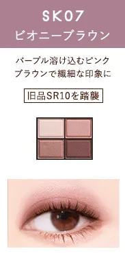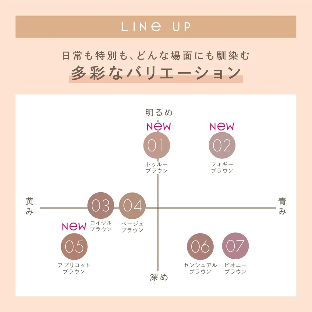カラー名SK01 トゥルーブラウンSK02 フォギーブラウンSK03 ロイヤルブラウンSK04 ベージュブラウンSK05 アプリコットブラウンSK06 センシュアルブラウンSK07 ピオニーブラウン
