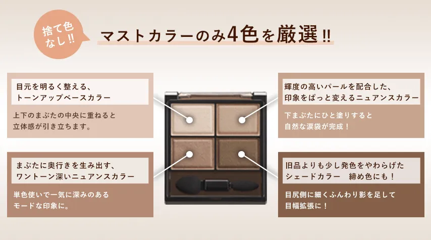 4色パレットですが、1色だけでもきちんと仕上がったように見せやすいのが魅力。(※3)