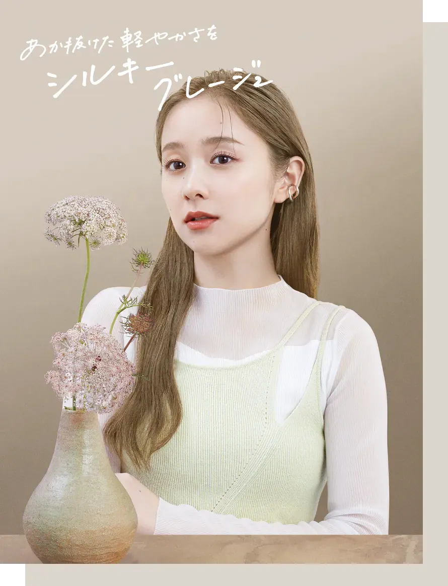 グレージュの髪色はグレーとベージュの配分によって色味に変化が出る特徴があります。こちらのシルキーグレージュは、ベージュの色味がやや強めのグレージュです。