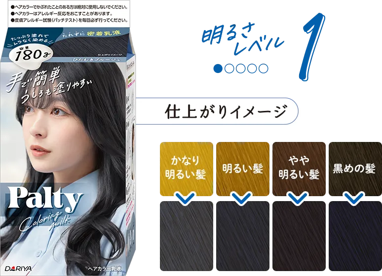 ダリヤ パルティ カラーリングミルク ひたむきブルージュは、黒髪にブルーを混ぜたような、クールウィンターさんにぴったりのひんやりとしたカラー。